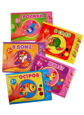 Альбомы для рисования пальчиковыми красками: Тропики, Чудесный остров, Кто где живет, В доме, В саду (комплект из 5 книг)