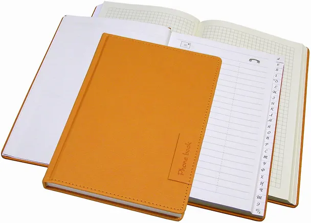 Мягкая обложка (картон+поролон+кожзам) из кожзаменителя оранжевого цвета с петлей для крепления ручки, скругленными углами и слепым тиснением надписи, формат 215х145х20 мм, 208 стр., алфавитная вырубка. Раздел для записи телефонов отпечатан на белой бумаге. Дополнительный раздел для заметок в клетку отпечатан на тонированной бумаге