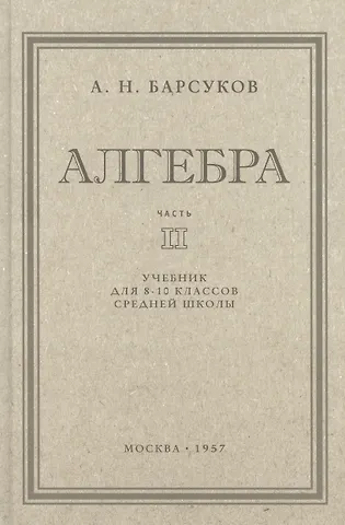 Алгебра. Часть II. Учебник для 8-10 классов. 1957 год. Барсуков А. Н. Данная книга представляет собой репринтное издание учебника па алгебре А. Н. Барсукова для 8-10 классов средней школы (1957 год, часть 2). Автор подробно объясняет новый материал, даёт необходимые определения, примеры решения задач и уравнений. Ученики познакомятся с действительными числами, понятием степеней с натуральным, нулевым и отрицательным показателями, уравнениями разного вида, аргументом и функцией, пределами, прогрессиями, логарифмами и др. Кроме того, они научатся возводить числа в квадрат и извлекать из них квадратный корень, решать задачи на максимум и минимум, совершать действия над комплексными числами и т.