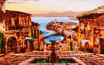 Алмазная мозаика 30х40см Фонтан на набережной блестящая