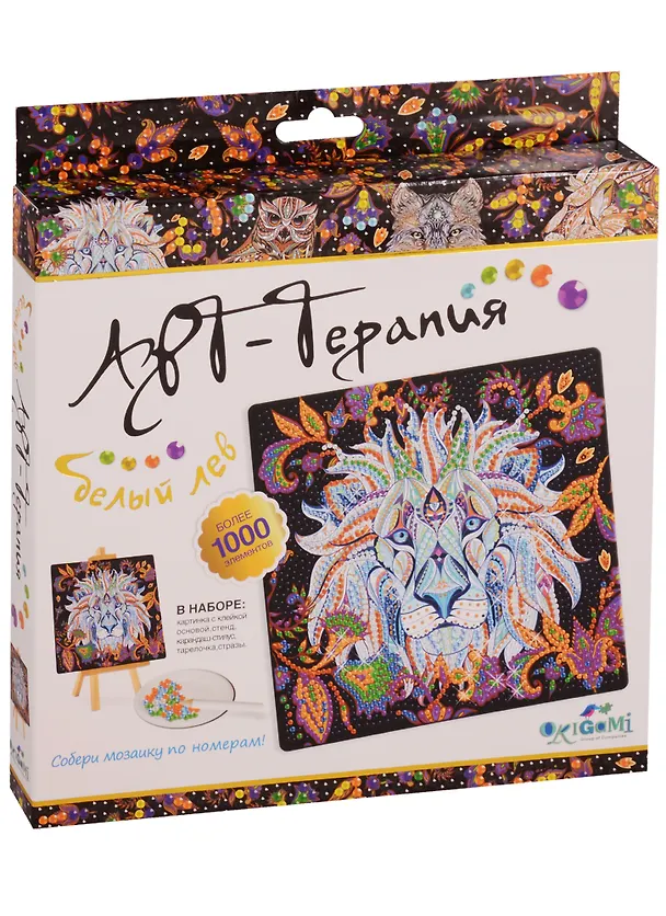 Коллекция алмазных узоров «Арт-Терапия» погружает в мир фэнтези. Выкладывайте алмазами Белого Льва, Золотую Сову, Ночного волка, Огненного Льва. Создавайте панораму из 4 картин. Оригинальное украшение интерьера. Алмазные картины сравнительно просты в изготовлении. Необходимо снять защитный слой с клеевой основы и с помощью карандаша-стилуса приклеить стразы по номеру и цвету. Готовую картинку можно поставить на мольберт, который входит в набор. Блестящий результат восхищает всех!