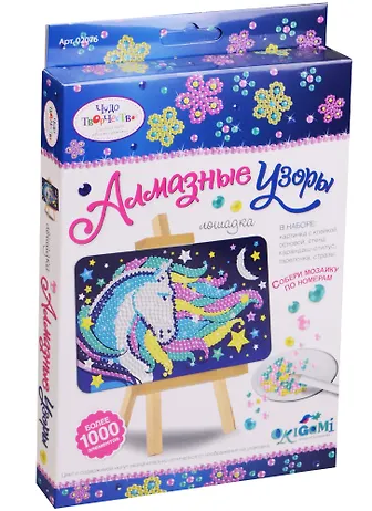 Набор "Алмазные узоры" придется по душе ребенку, который любит заниматься творчеством. Маленький художник сможет самостоятельно создать сверкающую картину, изображающую очаровательную и быструю лошадку. Нужно высыпать стразы из пронумерованных пакетов на тарелочку и при помощи стилера наклеить их на соответствующие номерам фрагменты на картинке с клейкой основой.