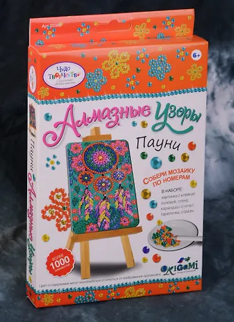 Сделать мозаику просто: возьми картинку, сними защитный слой, насыпь в тарелочку по очереди разные цвета страз и с помощью специального карандаша переноси стразы на клейкую основу по номеру и цвету. Готовую мозаику можно поставить на мольберт (входит в набор).