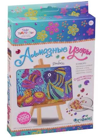 Готовую мозаику можно поставить на мольберт (входит в набор). Мозаику "Алмазные узоры. Рыбки" отличает высокое качество, авторские дизайны картинок, хороший состав набора.