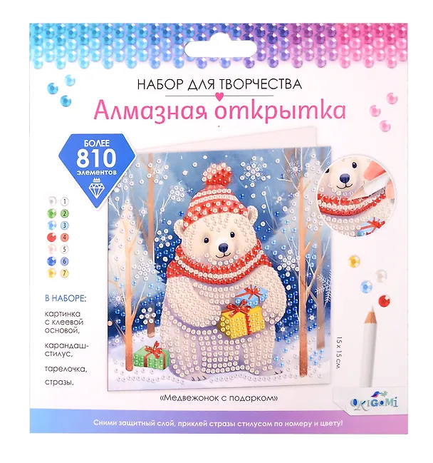 Алмазная открытка "Медвежонок с подарком"В наборе: картинка с клеевой основой, карандаш-стилус, тарелочка, стразы.
