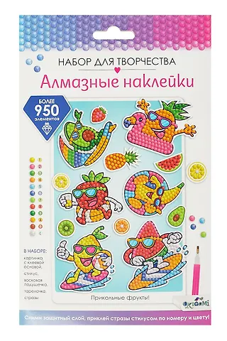 Алмазные наклейки «Прикольные фрукты» от Origami — простой способ познакомить ребёнка с техникой алмазной мозаики и получить яркий результат без долгой подготовки. Нужно по цветам выкладывать стразы на клейкую основу — детали удобно брать и размещать, тренируя усидчивость, внимание и мелкую моторику. Готовые блестящие наклейки подойдут для украшения тетрадей, дневника, открыток и подарочной упаковки. Набор легко взять с собой в дорогу или на занятия творчеством.