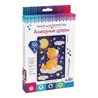 В наборе: картинка 10х15 см с клеевой основой, стразы, подставка, тарелочка, карандаш-стилус.