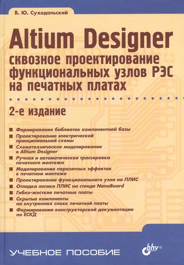 Книга посвящена проектированию радиоэлектронных функциональных узлов в среде Altium Designer. Описаны состав, настройка и основные приемы работы в среде Altium Designer. Подробно освещены вопросы формирования и редактирования электрической схемы, разработки печатной платы, а также трассировки печатного монтажа. Отдельно рассмотрены особенности реализации проекта на основе микросхем ПЛИС. Значительное внимание уделено схемотехническому моделированию. Приведены необходимые сведения о работе с библиотеками, взаимодействии с внешними базами данных, системе контроля версий, а также экспорте результатов.