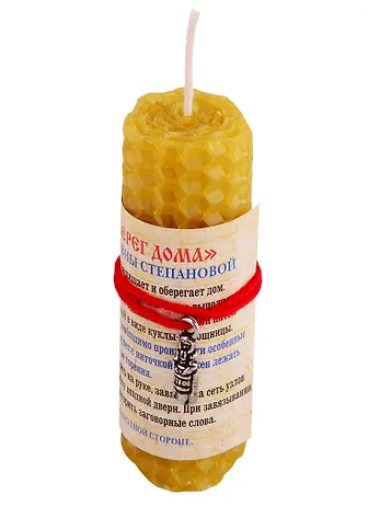 Свеча обряд, которая защищает и оберегает дом. Помогает подружиться с домовым. Свеча выполнена из натурального воска и обвязана шерстяной нитью с амулетиком-подвеской в виде куклы-помощницы. Над пламенем свечи необходимо произнести особенные заговорные слова. Амулет с ниточкой должен лежать возле свечи во время ее горения. Потом его можно носить на руке, завязав на сеть узлов или привязать на ручку входной двери. При завязывании узлов необходимо повторить заговорные слова.