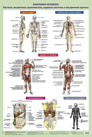 На плакате представлена полная анатомия человека: костная, мышечная, кровеносная, нервная системы и внутренние органы. Подойдёт для широкого круга читателей: школьников, студентов высших учебных заведений, художников и т.д. Простая терминология, понятные обозначения. От автора известных учебных пособий и атласов анатомии Р.П. Самусева.