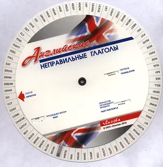 Диск-вертушка с неправильными глаголами отлично подойдет всем, кто изучает английский язык. В таблице помещены глаголы в трех формах с переводом. На обороте эти же глаголы объединены в группы со схожим способом образования. Наглядная подача материала позволит легко и быстро выучить формы неправильных английских глаголов.