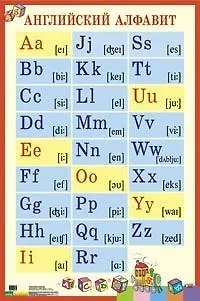 На красочно оформленом плакате помещен английский алфавит с транскрипцией. Гласные буквы отмечены красным цветом.