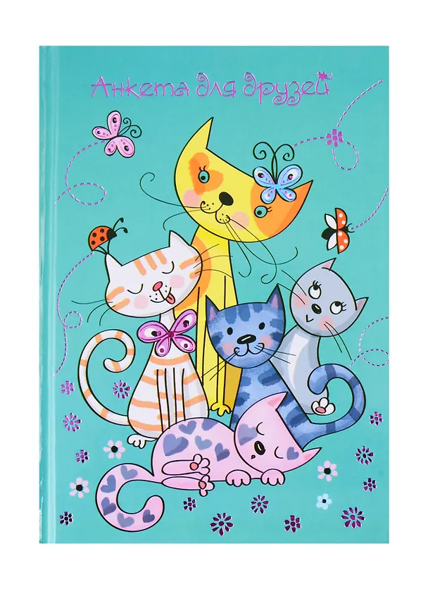 Анкета для друзей арт. 50027 КОТИКИ И БАБОЧКИ / А5 (145х205 мм), 128 л., блок - печать в две краски, твёрдый переплёт, глянцевая ламинация, тиснение цветной фольгой/