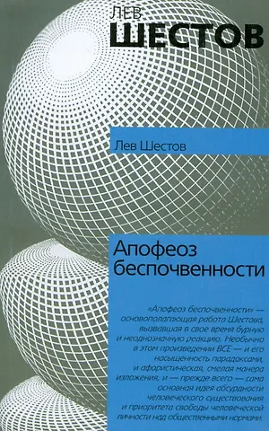 "Апофеоз беспочвенности" - основополагающая работа Шестова, вызвавшая в свое время бурную и неоднозначную реакцию. Необычно в этом произведении ВСЕ - и его насыщенность парадоксами, и афористическая, смелая манера изложения, и - прежде всего - сама основная идея абсурдности человеческого существования и приоритета свободы человеческой личности над общественными нормами.