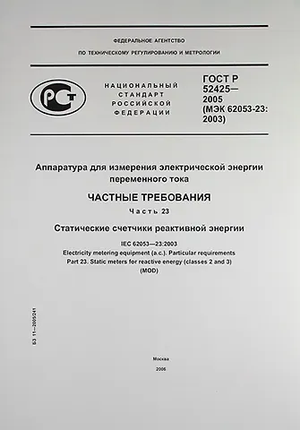 Аппаратура для измерения электрической энергии переменного тока.Частные требования. Часть 23.Статические счетчики реактивной энергии.ГОСТ Р 52425-2005