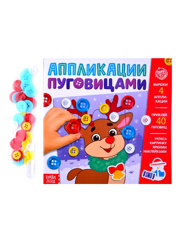С этой книгой так просто сделать красивый новогодний подарок. Выбери аппликацию, приклей яркие пуговички и укрась картинку наклейками. Чудесный подарок готов!