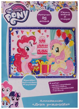 В наборе для 3D-аппликации "День рождения" ТМ "Мой маленький пони" 85 деталей: цветная картонная картинка (18х25,5 см), самоклеящиеся детали из мягкого материала ЭВА, гель-блеск. Детали легко приклеиваются и прочно держатся. Товар сертифицирован. Упаковка: пакет.