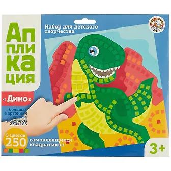 Набор для детского творчества - аппликация «Динозавр» состоит из 1 цветной картонной карточки размером 23х18,5 см и 5 цветных блоков. Ребенку необходимо украсить картинку объемными самоклеящимися квадратиками. Этот процесс превосходно разовьет моторику неловких пальчиков и стимулирует творческие наклонности. Набор рекомендуется для детей в возрасте от 3 лет. Порядок работы: 1. Подберите квадратик по цвету. 2. Отделите самоклеящейся квадратик от блока. 3. Приклейте квадратик на картонную основу, на соответствующее его цвету место. Внимание – из-за наличия мелких деталей контроль со стороны взрослых обязателен. Состав набора: - картонная карточка с напечатанным цветны