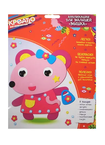 Создать очаровательную объемную фигурку мышки смогут даже малыши – без ножниц и клея! Просто снимите защитный слой с самоклеящихся деталей и наклейте их на цветную основу. Приклейте вращающиеся глазки, украсьте поделку стразами и блестящими элементами. Работая с этой поделкой, ребенок активно развивает мелкую моторику, восприятие цвета и формы, образно-логическое мышление, пространственное воображение и внимание. А в результате получается яркая фигурка, которая непременно станет для вашего малыша любимой игрушкой. В наборе для объемной фигурной аппликации «Мышка» ТМ «КРЕАТТО»: мягкая цветная основа фигурки, мягкие детали, стразы, мягкие блестящие детали с глиттером, пластмассовые вращающиеся