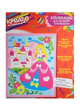 С аппликацией «Златовласка» ТМ «КРЕАТТО» легко справятся даже малыши – без ножниц и клея! Чтобы сделать красивую картинку, нужно выбрать детали, которые будут находиться в самом нижнем слое, затем, не вырезая, снять с них защитную пленку и вклеить в контур рисунка. Остальные детали нужно наклеивать слоями, следуя образцу. Фрагменты аппликации созданы из мягкого, приятного на ощупь материала ЭВА и обладают клеевым слоем, поэтому легко приклеиваются и прочно держатся. Работая с такой интересной поделкой, ребенок активно развивает мелкую моторику, восприятие цвета и формы, образно-логическое мышление, пространственное воображение, внимание и память. А в результате получается очаровательная карт