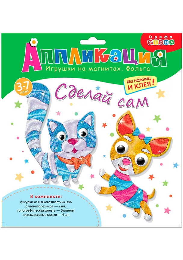 В наборе: — 2 основы из ЭВА с магнитным винилом, вырубленные по форме игрушки, на самоклеящейся основе, — голографическая фольга (6 цветов), — декоративные элементы на самоклеящейся основе (глазки), — цветная листовка-образец.