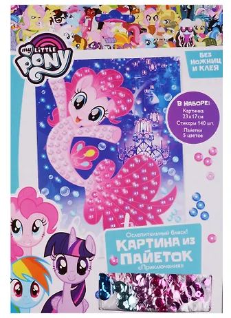 Наполни волшебный мир любимых героев ослепительным блеском! Аппликация из пайеток My Little Pony "Приключение" - интересное и полезное творчество. В наборе: картинка 17*25см, стикеры 140+ шт, разноцветные пайетки. Сделать красивую 3D-картинку очень просто: сначала необходимо приклеить двухсторонние стикеры, а затем, сверху, пайетки нужного цвета. Это просто блестяще!