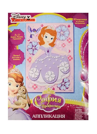 Аппликация София Прекрасная (3в1) (30386) (26,5х19см) (картинка+фигурка+детали+пайетки+стразы+бусинки+гель-блеск) (Disney Узнавайка) (3+) (упаковка)
