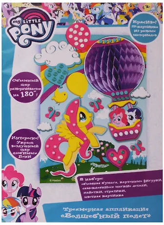 В наборе для трехмерной аппликации "Волшебный полет" ТМ "Мой маленький пони": цветная картонная картинка (18х25,5 см), объемное платьице, картонные фигурки, самоклеящиеся детали из мягкого материала ЭВА, бусинки, пайетки, стразы. Детали прочно приклеиваются. Товар сертифицирован. Упаковка: пакет.