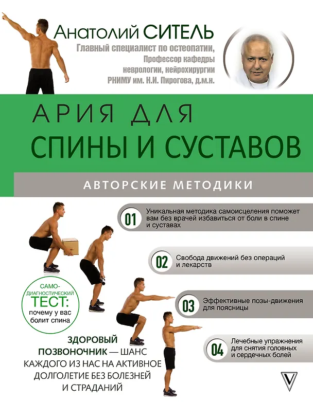 В своей книге профессор Анатолий Ситель знакомит читателя со своей уникальной методикой самоисцеления, которая позволит читателю самостоятельно с помощью специальных лечебных поз-движений избавиться от болей в разных отделах позвоночника и суставах и восстановить их гибкость и подвижность за короткий срок. В основе метода самостоятельной ликвидации боли в позвоночнике и суставах лежит идея расслабляющего воздействия в лечебных целях на спазмированную мышцу или группу мышц, непосредственно связанных с проблемным отделом позвоночника или суставом. Автор книги убежден, что состояние позвоночника определяет жизненный потенциал человека, что здоровый позвоночник - шанс каждого из нас на активное