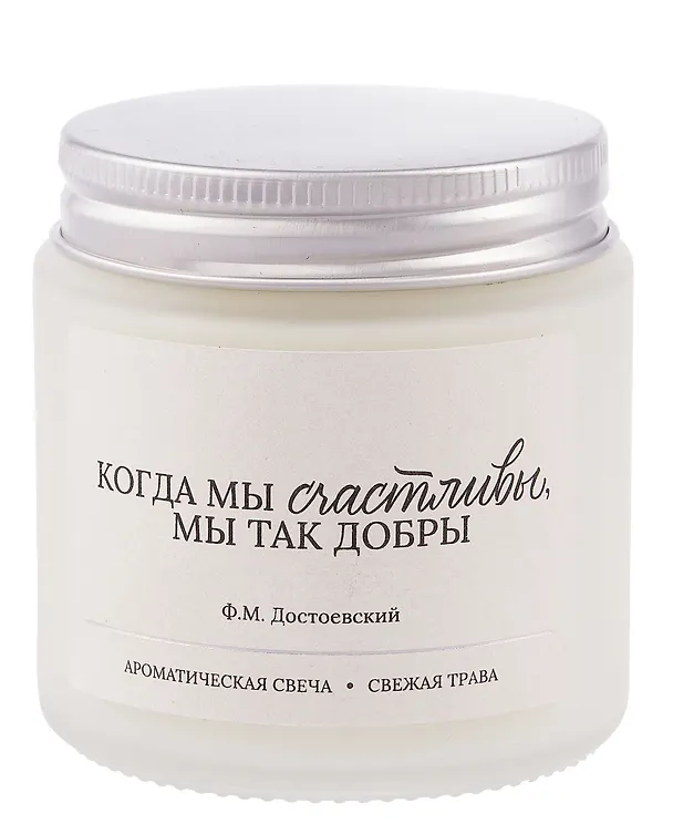 Ароматическая свеча "Ф.М. Достоевский Когда мы счастливы, мы так добры (Свежая трава)" (120мл, артикул LC2025-13) — это предмет декора, сочетающий в себе цитату из произведения Ф.М. Достоевского, аромат свежей травы и объем 120 мл, предположительно с восковым наполнителем.