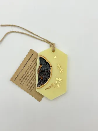 Ароматическое саше ручной работы, отличное решение для приятной ароматизации вашей одежды или белья. Аромасаше выполнено из натурального соевого воска с добавлением сертифицированных, безопасных и гипоаллергенных ароматических масел. Аромасаше WOODMSV не жирнит, тем самым не пачкая вашу одежду или белье.. ХАРАКТЕРИСТИКИ: СОСТАВ: Натуральный соевый воск, гипоаллергенная отдушка, сушеный лимон для декора, поталь для декора. РАЗМЕР: Высота - 9 см, ширина - 5 см. НАЗНАЧЕНИЕ: ароматическое саше предназначено для приятной ароматизации одежды или постельного белья. Применение: повесить в