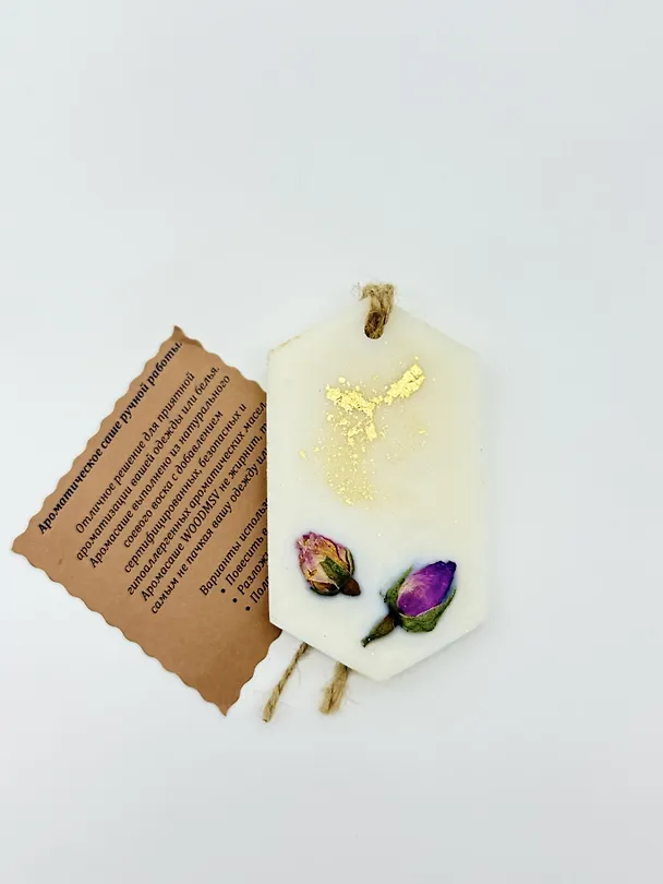 Ароматическое саше ручной работы, отличное решение для приятной ароматизации вашей одежды или белья. Аромасаше выполнено из натурального соевого воска с добавлением сертифицированных, безопасных и гипоаллергенных ароматических масел. Аромасаше WOODMSV не жирнит, тем самым не пачкая вашу одежду или белье. ХАРАКТЕРИСТИКИ: СОСТАВ: Натуральный соевый воск, гипоаллергенная отдушка, сухоцветы для декора, поталь для декора. РАЗМЕР: Высота - 9 см, ширина – 5 см НАЗНАЧЕНИЕ: ароматическое саше предназначено для приятной ароматизации одежды или постельного белья. Приме