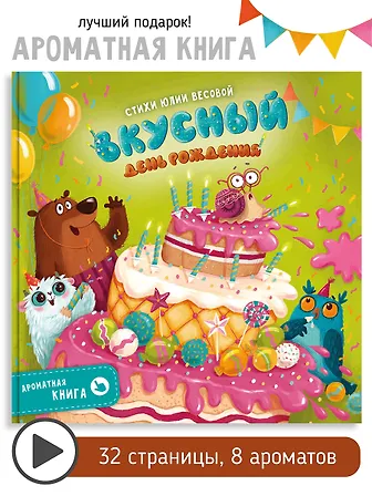Книга «Вкусный День Рождения» - идеальный подарок для малышей и детей разных возрастов. Она не только увлекательна и интересна, но и позволяет ребенку насладиться ароматами разных стран и продуктов. Книги с различными ароматами очень увлекательны. Выполняя задания на каждом развороте, малыш станет активным участником рассказанных историй. Смешные стихи Юлии Весовой и иллюстрации Евгении Смоленцевой влюбляют в себя уже с первых страниц! Польза книги для детей не подлежит сомнению. Дети очень любят, когда им читают. Именно от родителей малыш слышит первые сказки, и если родители не игнорируют чтение даже самых маленьких, то с весьма большой вероятностью книга вскоре станет лучшим другом ребёнк