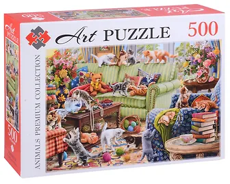 Когда цифровой художник нашёл набор шаблонов с котятами и не знает теперь, как остановиться )) На мой вкус, слишком много котов, но дарёному коту, в смысле коню... Тем более, что качество пазла весьма достойное. Четкая, яркая картинка, толстые пазлинки, которые легко и приятно брать в руки, интересная нарезка. Благодаря множеству предметов на картинке пазл собирается просто даже начинающим.
