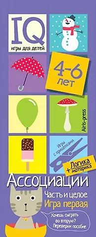 «Ассоциации. Часть и целое» – это игровой комплект для развития, ассоциативного мышления, логического мышления и моторики. Комплект представляет собой небольшой блокнот на пружине, состоящий из 30 картонных карточек, и 8 разноцветных прищепок. Выполняя задания на карточках-страничках, ребёнок учится анализировать, сравнивать, искать логические связи. Прикрепляя прищепки и проходя лабиринты, он развивает моторику и координацию движений. Проверить правильность своих ответов ребёнок сможет самостоятельно, просто проводя пальчиком по лабиринтам на оборотной стороне карточек. Простота и удобство комплекта позволяют использовать его в детском саду, дома и на отдыхе. Предназначен для детей старше 4
