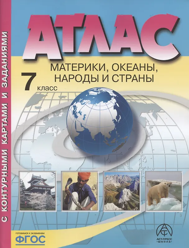 Атлас с комплектом контурных карт с заданиями "Материки, океаны, народы и страны" для 7 класса.