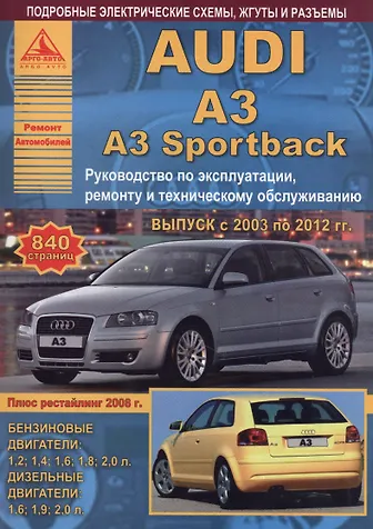Автомобиль Audi A3 / A3 Sportback. Руководство по эксплуатации, ремонту и техническому обслуживанию. Выпуск с 2003 по 2012 гг. Бензиновые двигатели: 1,2 1,4 1,6 1,8 2,0 л. Дизельные двигатели: 1,6 1,9 2,0 л.