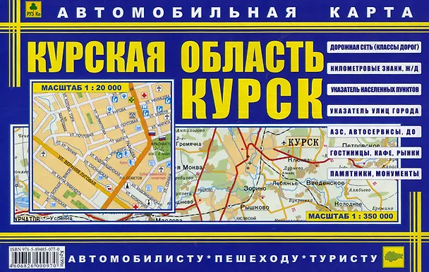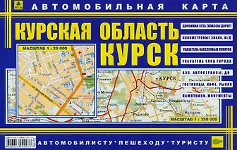 Автомобильные карты Курска (масштаб 1:20000) и Курской области (масштаб 1:350000). Дорожная сеть (классы дорог), километровые знаки, железные дороги, АЗС, автосервисы, ДО, гостиницы, кафе, рынки, памятники, монументы. Содержит указатель населенных пунктов, указатель улиц города.
