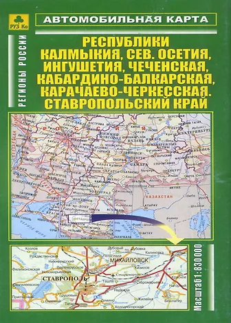 Калмыкия, Северная Осетия, Ингушетия, Чеченская, Кабардино-Балкарская, Карачаево-Черкесская Республики. Ставропольский край. Автомобильная карта