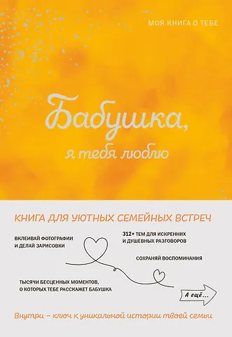 Книга «Бабушка, я тебя люблю!» — это не только идеальный подарок для близкого человека на Новый год, день рождения, 8 марта или день матери, но и ваш проводник в мир психологии и саморазвития, ведь узнавая свои корни, мы узнаем и настоящих себя, а значит, вы сможете разобраться и в вопросах к себе, которые у всех нас возникают в течение жизни. Издание подойдет и тем, кто ищет семейный фотоальбом необычного формата, и понравится вам, если вы обращали внимание на бестселлеры «С тобой я дома», «К себе нежно».