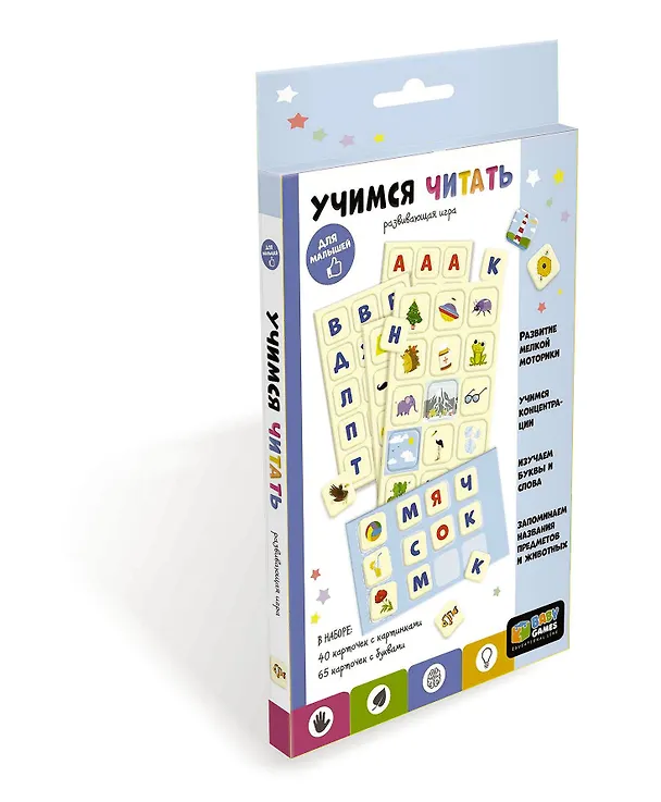 В наборе: 40 карточек с картинками, 65 карточек с буквами, двусторонний планшет для составления слов.