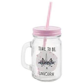 Банка с ручкой и крышкой для коктейлей Кошечка-единорог (стекло) (450 мл)