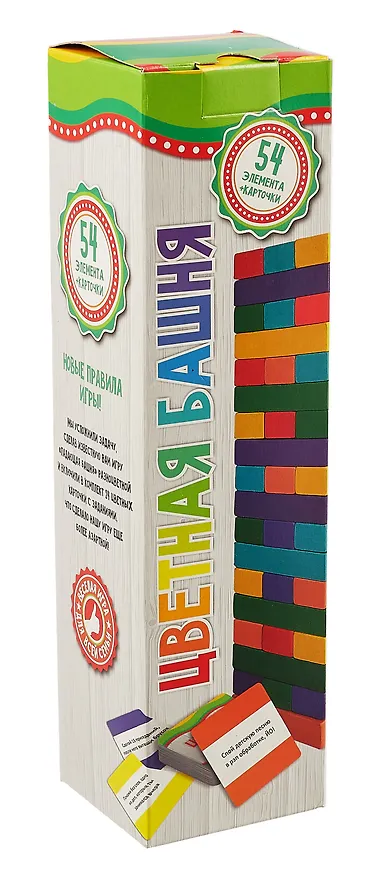 Комплект из 54 разноцветных брусков плюс 24 карты с заданиями. Массив дерева, эко краски. Теперь играть в известную игру еще веселее!