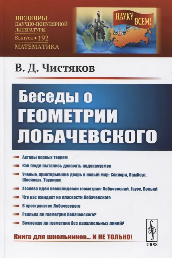 Настоящая книга в популярной и доступной форме знакомит массового читателя с историческим путем развития первой неевклидовой геометрии — геометрии Лобачевского. В книге показано, в чем суть открытия Лобачевского и его геометрии. Материал состоит из одиннадцати глав-бесед, в которых вначале излагается история развития геометрии Лобачевского, а затем в наглядной форме с использованием большого количества рисунков и конкретных истолкований (интерпретаций) разъясняются ее основные положения. От читателя не требуется какой-то особой подготовки, кроме той, которую он получил в школе. Книга адресована в первую очередь широкому кругу читателей, интересующихся математикой, и может служить учебным пос