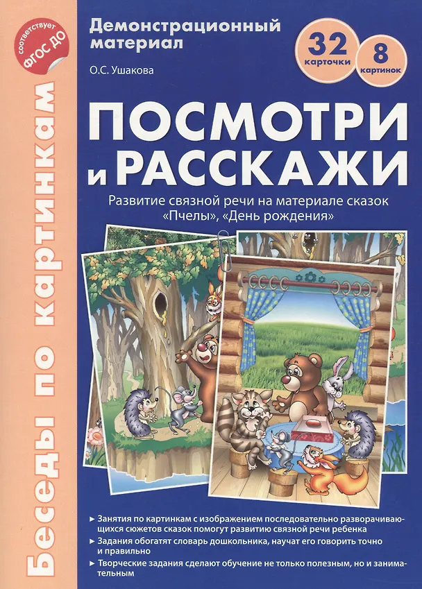 Демонстрационный материал состоит из двух папок «Посмотри и расскажи» с авторскими сказками О.С. Ушаковой, связанными друг с другом «сквозными» персонажами, — новинка в проверенном временем учебно-методическом комплекте автора.