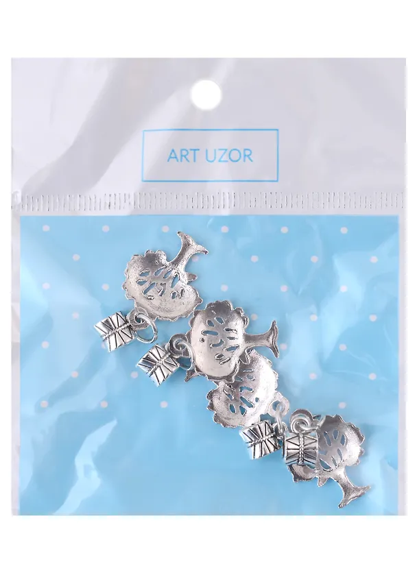 Купил этот набор для творчества шестилетней внучки. Хорошие подвесочки в форме деревьев, качество их понравилось. Изготовлены они аккуратно и смотрятся красиво. На фотографии сайта подвески показаны с изнаночной стороны, а лицевая выглядит интереснее с мелкими листьями. Основной цвет светло-серебряный, а кое-где темный. Размер небольшой, ширина 1,6 см, а высота с колечком 2,1 см.