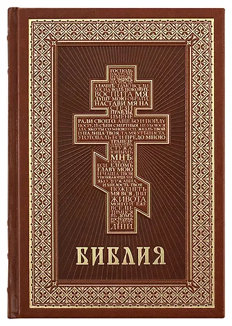 Библия на русском языке в Синодальном переводе с неканоническими книгами. Издание среднего формата в кожаном переплете с блинтовым тиснением и с тиснением золотой фольгой. Текст Нового Завета напечатан более крупным шрифтом. В приложении помещены библейские карты, указатели ветхозаветных, евангельских и апостольских церковных чтений. Использован золотой обрез блока, форзац выполнен из дизайнерской бумаги. Для удобства книга снабжена ленточкой-закладкой.