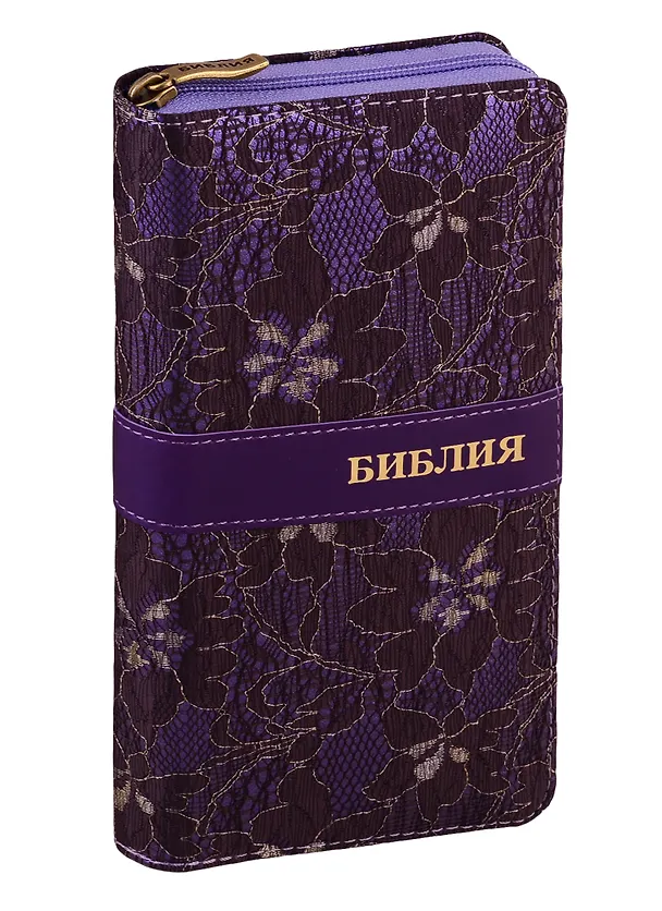 .Формат 83х175 мм, переплет с тонкой вышивкой, молния, "золотой" обрез с голографическим напылением, закладка, индексы для поиска библейских книг.