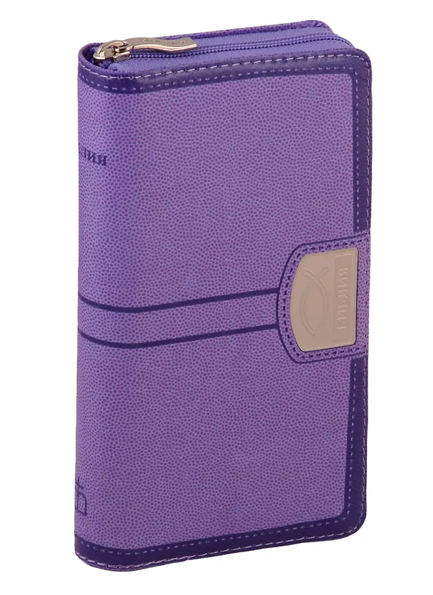 .Формат 83х175 мм, переплет из экокожи на молнии, "серебряный" обрез с голографическим напылением, закладка, индексы для поиска библейских книг.