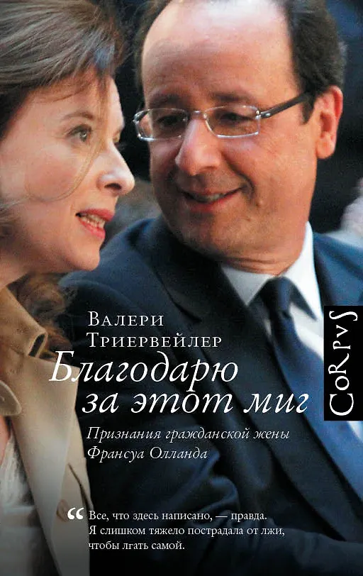 Валери Триервейлер, журналистка “Пари-Матч”, несколько лет была гражданской женой президента Франции Франсуа Олланда. “Благодарю за этот миг” — ее от- кровенный рассказ об их отношениях и о скандальном разрыве после того, как желтая пресса опубликовала фотографии, свидетельствующие о связи президента с актрисой Жюли Гайе. Исповедь Валери Триервейлер включает историю ее жизни и нелегкого пути к успеху, а также малоизвестные подробности политических собы- тий. С журналистским мастерством она описывает будни Елисейского дворца, где провела полтора года в качестве первой леди, встречи с виднейшими политиками и закулисные интриги вокруг президентских и парламентских выборов. Во Фран- ции книга ст